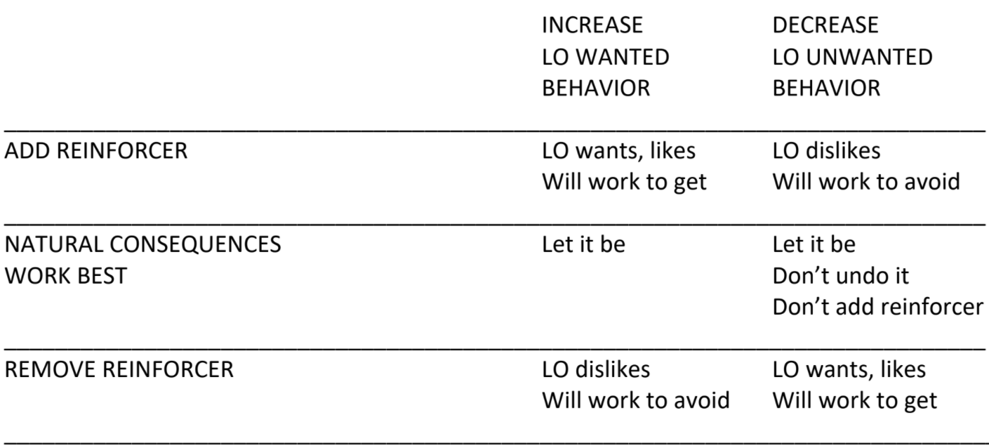 All reinforcers, pleasant and unpleasant, increase the likelihood of your loved one’s wanted or unwanted behaviors continuing. Research by B. F. Skinner and others psychologists has shown that although punishment may weaken or suppress unwanted behavior it does not eliminate it. People can learn new behaviors, but they can’t unlearn old behaviors. Punishment does not teach new wanted behavior. (LO is shorthand for your loved one.)